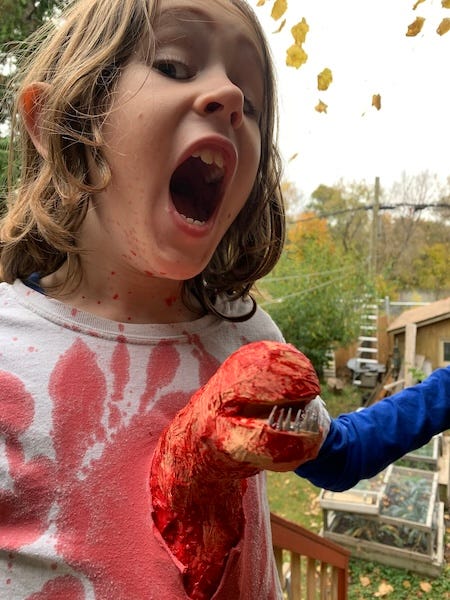 My kid hasn’t yet entered his Stephen King era, but we have been experimenting with our own version of letting him access content that might be too mature for his age. At the moment, he’s obsessed with Xenomorphs and the Alien franchise, and we (by “we” I mean “Colin, almost entirely on his own”) have been crafting an elaborate chest-burster Halloween costume for him all month long, which is finally going to make its neighbourhood debut tonight.