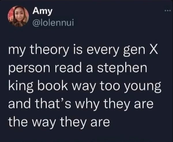 Is there an expression that means the opposite of “gilding the lily”? Like, adding something awful to a situation that is already quite bad? A rotten cherry on top of a shit sundae? Because that’s what reading and watching It felt like for me at the time. I already walked to school with a baseball bat, because I reasoned that a predator might pass me over, judging that some other pre-teen without a potential weapon might be an easier target. I didn’t need to also be afraid of supernatural clowns who infiltrate my dreams and make me question reality itself. My fledgeling insomnia loved It. Sleep was a distant stranger for months.